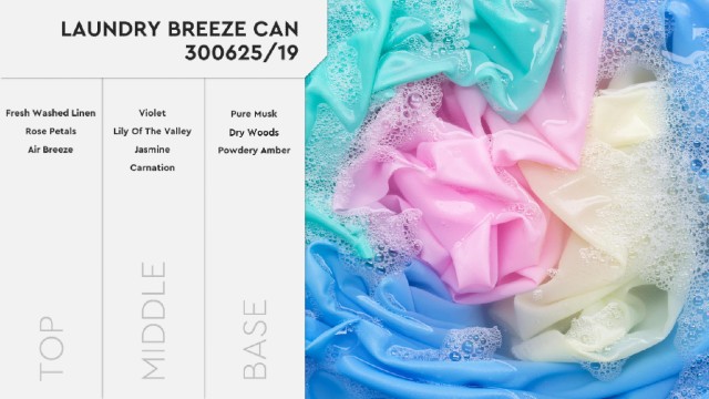 LAUNDRY BREEZE– φέρνει στο χώρο τη φρεσκάδα των φρεσκοπλυμένων ρούχων που στεγνώνουν στον ήλιο. Καθαρό, ανάλαφρο και αναζωογονητικό.