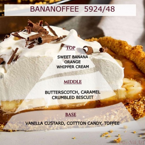 Το  άρωμα BANANOFFEE (από banana + toffee) είναι ιδανικό για ένα ζεστό, γλυκό και comfort gourmand άρωμα, με νότες ώριμης μπανάνας, καραμέλας, βουτύρου , βανίλιας και καφέ.  Θυμίζει κυριολεκτικά επιδόρπιο.
